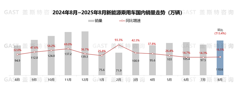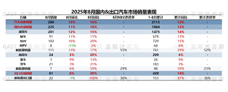 2025年8月,中國(guó)汽車(chē)市場(chǎng)銷(xiāo)售285.7萬(wàn)輛,環(huán)比增長(zhǎng)10.1%,同比增長(zhǎng)16.4%。具體來(lái)看,在“兩新”政策及地方普惠性政策的協(xié)同發(fā)力下,國(guó)內(nèi)NEV市場(chǎng)同環(huán)比增速均高于整體市場(chǎng);同時(shí),汽車(chē)出口維持高增長(zhǎng)態(tài)勢(shì),進(jìn)一步為8月市場(chǎng)的回升注入強(qiáng)勁動(dòng)力。