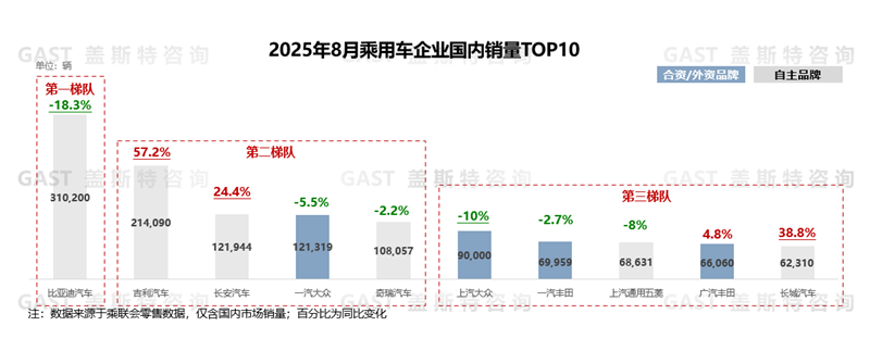 8月,TOP10中自主品牌占據(jù)6席,其中吉利、長(zhǎng)安、長(zhǎng)城保持同比兩位數(shù)高增長(zhǎng);反觀合/外資品牌,僅廣汽豐田實(shí)現(xiàn)正增長(zhǎng)。具體來(lái)看,比亞迪:受吉利、零跑等競(jìng)企沖擊,國(guó)內(nèi)市場(chǎng)銷(xiāo)量同比大幅下滑,8月份額為15.4%,同比下滑4.5個(gè)百分點(diǎn);吉利:8月國(guó)內(nèi)銷(xiāo)量同比超50%增長(zhǎng),單月市場(chǎng)份額達(dá)10.6%,同比增長(zhǎng)3.5個(gè)百分點(diǎn);長(zhǎng)安:國(guó)內(nèi)NEV銷(xiāo)量超7萬(wàn)輛,同比增長(zhǎng)81%,其中啟源國(guó)內(nèi)銷(xiāo)量超3.2萬(wàn)輛;奇瑞:國(guó)內(nèi)銷(xiāo)量同比小幅下滑,其中NEV銷(xiāo)量近7萬(wàn)輛,同比增長(zhǎng)8.4%;主銷(xiāo)燃油車(chē)國(guó)內(nèi)銷(xiāo)量同比下滑,疊加NEV車(chē)型表現(xiàn)不佳,8月上汽大眾同比兩位數(shù)下滑;廣汽豐田:國(guó)內(nèi)銷(xiāo)量同比小幅增長(zhǎng),除一口價(jià)政策帶動(dòng)終端需求外,鉑智3X銷(xiāo)量創(chuàng)歷史新高;長(zhǎng)城:國(guó)內(nèi)銷(xiāo)量同比增長(zhǎng)超38%,哈弗品牌憑借多款車(chē)型上市拉動(dòng),單月銷(xiāo)量同比增長(zhǎng)近50%。