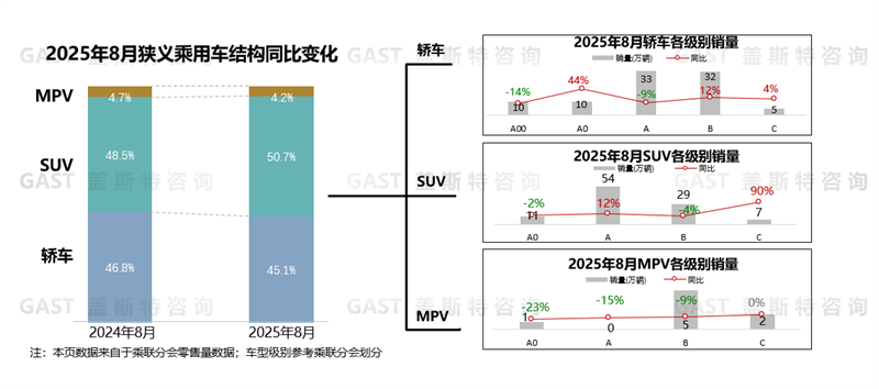 MPV份額為4.2%,同比下降0.5個(gè)百分點(diǎn)。低端及B級(jí)市場(chǎng)表現(xiàn)不佳。C級(jí)市場(chǎng)相對(duì)穩(wěn)定,別克GL8單月銷(xiāo)量維持在1萬(wàn)輛左右;8月末全新騰勢(shì)D9上市,銷(xiāo)量拉動(dòng)作用尚未顯現(xiàn);2026款嵐圖夢(mèng)想家于9月上市,8月銷(xiāo)量小幅回落;高山銷(xiāo)量連續(xù)三個(gè)月穩(wěn)定在5千輛以上。