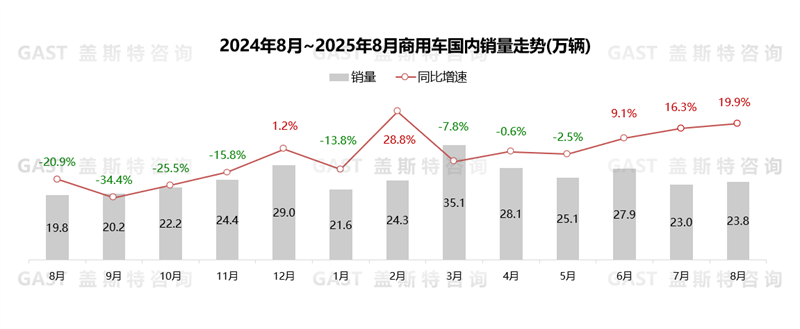 8月,商用車(chē)國(guó)內(nèi)銷(xiāo)售23.8萬(wàn)輛,環(huán)比增長(zhǎng)3.4%,同比增長(zhǎng)19.9%。由于去年同期基數(shù)較低,且政策推動(dòng)NEV商用車(chē)同比增長(zhǎng)59%,多重因素共同作用下,國(guó)內(nèi)商用車(chē)市場(chǎng)實(shí)現(xiàn)同比高增長(zhǎng)。