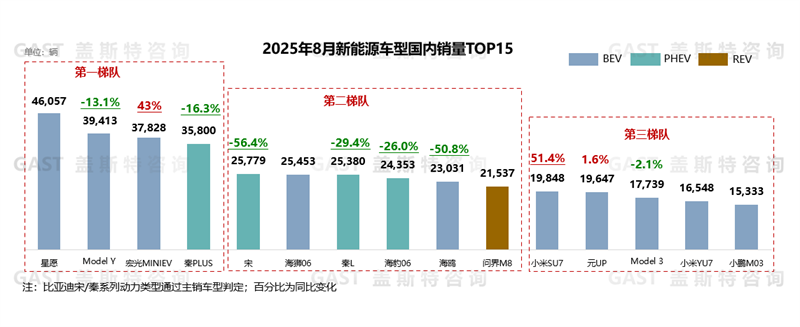 8月,比亞迪在TOP15中占據(jù)7席,仍保持?jǐn)鄬宇I(lǐng)先;從動(dòng)力形式看,TOP15中純電車(chē)型占據(jù)10席。具體來(lái)看,吉利星愿:銷(xiāo)量連續(xù)8個(gè)月保持正增長(zhǎng),8月再創(chuàng)歷史新高;宏光MINI EV:8月同環(huán)比增幅均超過(guò)35%,月銷(xiāo)量重返3萬(wàn)輛以上;宋系列:銷(xiāo)量下滑幅度持續(xù)擴(kuò)大,其中宋PLUS同比下滑超2倍;問(wèn)界M8:上市后訂單穩(wěn)定增長(zhǎng),且產(chǎn)能持續(xù)爬坡,連續(xù)三個(gè)月銷(xiāo)量突破2萬(wàn)輛,同時(shí)也成為T(mén)OP15車(chē)型中唯一價(jià)位在40萬(wàn)元左右的車(chē)型;小米SU7:產(chǎn)能分配上持續(xù)向YU7讓步,銷(xiāo)量已連續(xù)三個(gè)月低于2.5萬(wàn)輛,8月環(huán)比下滑超18%;Model 3:長(zhǎng)續(xù)航版上市且推出五年免息政策,月銷(xiāo)量環(huán)比增長(zhǎng)超80%;小米YU7:產(chǎn)能穩(wěn)步提升,上市第二個(gè)完整月銷(xiāo)量突破1.6萬(wàn)輛。