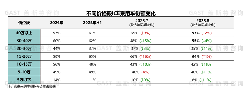 從細(xì)分價(jià)格帶來(lái)看,ICE乘用車(chē)在15-20萬(wàn)元及30萬(wàn)元以上市場(chǎng)延續(xù)了強(qiáng)勢(shì)表現(xiàn),細(xì)分市場(chǎng)份額仍超過(guò)55%。30萬(wàn)元以上市場(chǎng)中,BBA等傳統(tǒng)豪華品牌部分車(chē)型保持10萬(wàn)元以上的降價(jià)幅度,目前仍占據(jù)該價(jià)格段60%份額,但隨著自主品牌加速布局豪華市場(chǎng),預(yù)計(jì)2025年末該區(qū)間ICE份額將下滑至50%以下;15-20萬(wàn)元市場(chǎng)則因主流合資中高端車(chē)型售價(jià)下探、自主NEV布局較少,預(yù)計(jì)2025年末ICE在該區(qū)間仍有望守住60%市場(chǎng)份額。