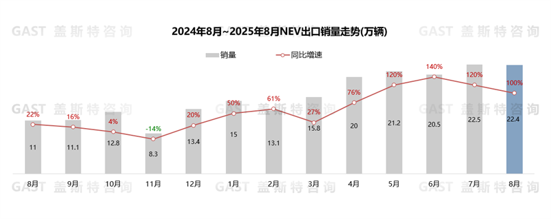8月,新能源汽車(chē)出口22.4萬(wàn)輛,環(huán)比下降0.6%,同比增長(zhǎng)100%,已連續(xù)四個(gè)月實(shí)現(xiàn)同比翻倍增長(zhǎng)。具體來(lái)看,NEV乘用車(chē)是增長(zhǎng)核心動(dòng)力,8月同比增長(zhǎng)1.1倍,其中對(duì)墨西哥、土耳其等地區(qū)的出口增量尤為顯著;從動(dòng)力類(lèi)型看,BEV和PHEV車(chē)型均貢獻(xiàn)超5萬(wàn)輛的出口增量,且插混車(chē)型占NEV出口的份額較去年同期提升16個(gè)百分點(diǎn),成為出口結(jié)構(gòu)中的重要增長(zhǎng)極。