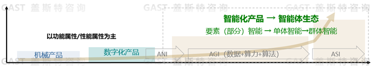數(shù)智汽車的演化路徑清晰明了:從數(shù)字化出發(fā),經(jīng)由數(shù)據(jù)化、智能化(初級智能),最終達(dá)到AI化。汽車從過去的以功能/性能屬性為主的機(jī)械產(chǎn)品、數(shù)字化產(chǎn)品,逐步轉(zhuǎn)變?yōu)橹悄芑a(chǎn)品,最終將形成智能體生態(tài)。其中,情感屬性(主動智能)將貫穿智能化產(chǎn)品與生態(tài)發(fā)展的始終,并占據(jù)主導(dǎo)地位,從幫助人、解放人,到理解人,不斷發(fā)展,最終更好地服務(wù)人,實現(xiàn)車更懂人。同時,在智能化產(chǎn)品向智能體生態(tài)演變的過程中,智能的層次也在不斷提升,從要素(部分)智能,到單體智能,再到群體智能。這一轉(zhuǎn)變不僅體現(xiàn)在技術(shù)層面,更體現(xiàn)在其對人類生活方式的深遠(yuǎn)影響。