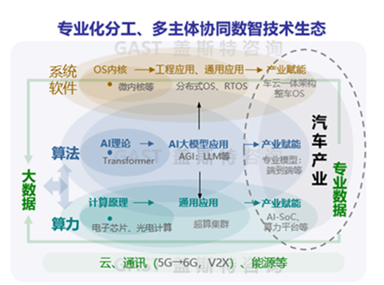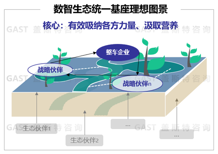 蓋斯特研究團(tuán)隊認(rèn)為,數(shù)智汽車持續(xù)進(jìn)化依靠的是新技術(shù)能力的不斷賦能、背后研發(fā)范式的轉(zhuǎn)變以及多主體生態(tài)資源的充分協(xié)作,因此生態(tài)化發(fā)展是必由之路。