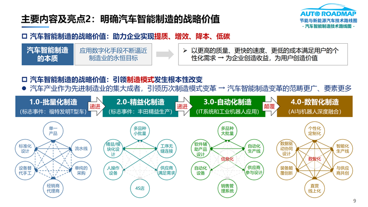 2.明確了汽車智能制造的戰(zhàn)略價(jià)值,即助力企業(yè)實(shí)現(xiàn)提質(zhì)、增效、降本、低碳