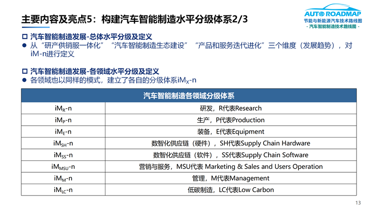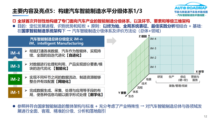 5.全球首次開(kāi)創(chuàng)性地構(gòu)建了專門面向汽車產(chǎn)業(yè)的智能制造分級(jí)體系(iM-n),以及環(huán)節(jié)、要素和等級(jí)三維架構(gòu)