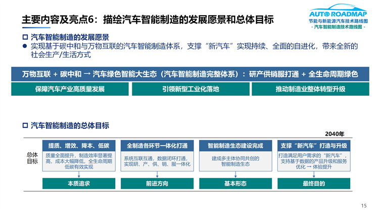 6.描繪了汽車智能制造的發(fā)展愿景和總體目標(biāo): 實(shí)現(xiàn)基于碳中和與萬(wàn)物互聯(lián)的汽車智能制造體系,支撐“新汽車”實(shí)現(xiàn)持續(xù)、全面的自進(jìn)化,帶來(lái)全新的社會(huì)生產(chǎn)/生活方式