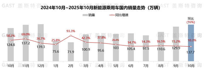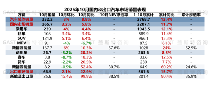 2025年10月,中國汽車市場銷售332.2萬輛,環(huán)比增長3%,同比增長8.8%。這一增長態(tài)勢的背后,是多重有利因素的共同推動:車市進入“金九銀十”傳統(tǒng)銷售旺季,車企新車供給持續(xù)加碼,產能與交付節(jié)奏同步加快;與此同時,NEV出口保持高增長態(tài)勢;加之2026年NEV相關優(yōu)惠政策已明確收緊,促使部分消費者購車需求前置,共同帶動10月汽車市場穩(wěn)步增長。