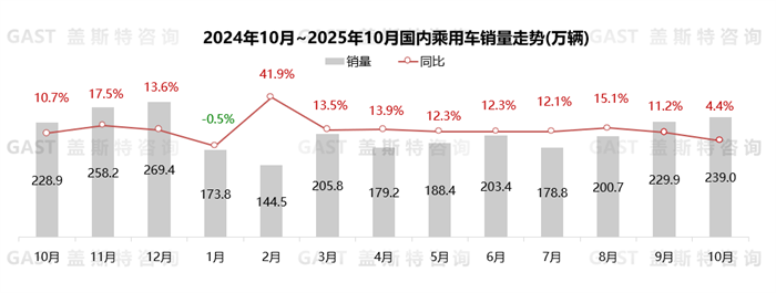 10月,國內乘用車市場銷售239萬輛,環(huán)比增長4%,同比增長4.4%。政策方面,三部門發(fā)布購置稅、車船稅調整政策,促使部分購車需求前置;供給方面,傳統(tǒng)自主車企年度改款及全新NEV車型密集上市;需求方面,各地補貼政策收緊時間不同,地方消費節(jié)奏出現(xiàn)差異。