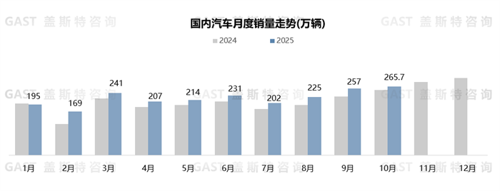 10月,國內汽車市場銷售265.7萬輛,環(huán)比增長3.2%,同比增長5.8%。其中,國慶期間車企推出專屬優(yōu)惠,帶動國內乘用車市場熱度回升;國內商用車市場進入“金九銀十”物流旺季,疊加政策驅動,同比增長超20%。