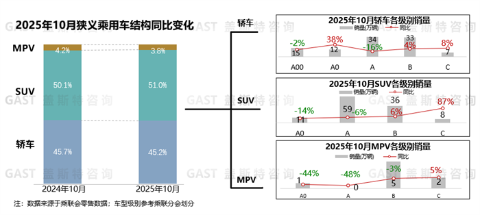 轎車份額為45.2%,同比下降0.5個百分點。A00及A0級市場銷量穩(wěn)定,A00級宏光MINIEV銷量突破6萬輛,環(huán)比連續(xù)4個月正增長;A0級中繽果S上市首個完整月,銷量超1.7萬輛。A、B級NEV增長優(yōu)于ICE,零跑、紅旗等車型增長較高;C級同比增長,其中享界S9T上市首個完整月銷量超4.8千輛。