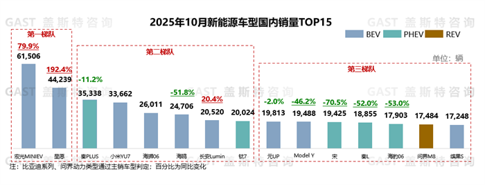 10月,比亞迪在TOP15中占據(jù)8席,仍保持斷層領先,但多數(shù)車型銷量同比出現(xiàn)較大下滑。具體來看,宏光MINI EV:四門版貢獻主要增量,單月銷量超6萬輛,連續(xù)2個月保持同比超75%增長;吉利星愿:2026款新車上市,車型連續(xù)5個月銷量穩(wěn)定在4萬輛以上;小米YU7:產能持續(xù)爬坡,累計訂單加速交付,月銷量突破3.3萬輛;海鷗:受同級競品影響,連續(xù)3個月同比降幅超45%;鈦7:上市首個完整月銷量超2萬輛,成為當前市場唯一銷量突破2萬輛的方盒子SUV;宋:受外部同級競品增多及內部產品分流影響,月銷量排名跌出TOP10。