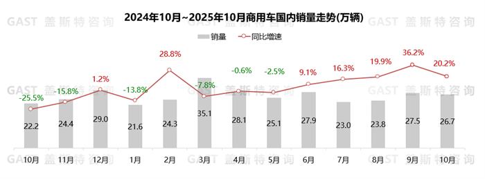 10月,商用車國內銷售26.7萬輛,環(huán)比下降3.2%,同比增長20.2%。去年同期基數(shù)較低,且政策推動NEV商用車同比增長超50%,使得國內商用車市場同比高增長。