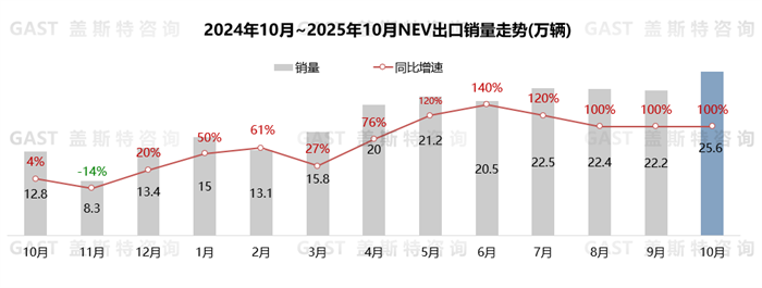 10月,新能源汽車出口25.6萬輛,環(huán)比增長15.4%,同比增長99.9%。其中,插混占NEV出口份額同比提升16.4個百分點,銷量同比增長2.7倍。