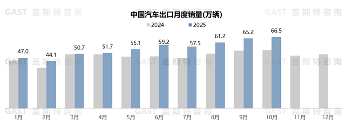 10月,汽車出口66.5萬輛,環(huán)比增長2.1%,同比增長22.9%。從動力類型看,ICE出口量同比下降0.9%;NEV出口仍維持同比高增長。