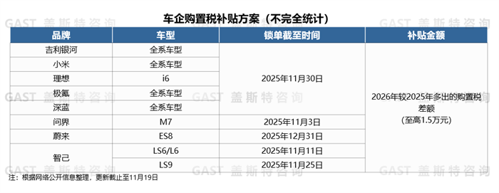 蓋斯特觀點:車企推出購置稅“兜底”方案,采用“提前鎖單+差額補貼”方式,一方面,刺激用戶消費,推動訂單年內轉化,助力今年交付量沖刺;另一方面,提前鎖定未來銷量,最大程度緩解2026年政策切換期帶來的經(jīng)營風險。
